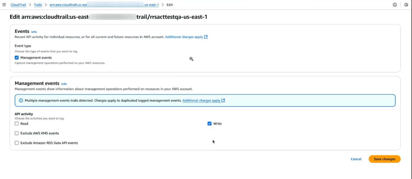 The CloudTrails that have Write-only management events need to be configured to ensure that API operations (such as Create, Update, and Delete) that modify AWS resources are captured, while Read-only events (such as Login, Describe or List actions) are excluded. Configuring CloudTrails that have Read-only or any other events will not be supported by CoreStack.