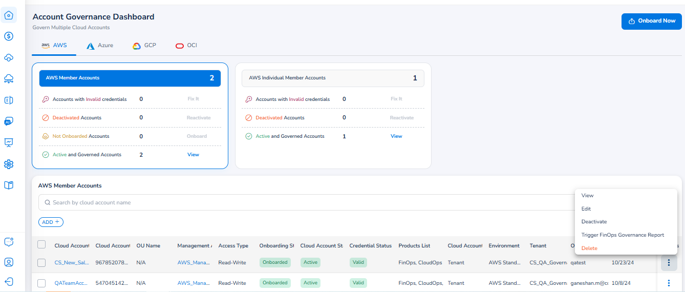 If you select the View action, then you can directly go to the Cloud Account Governance page.