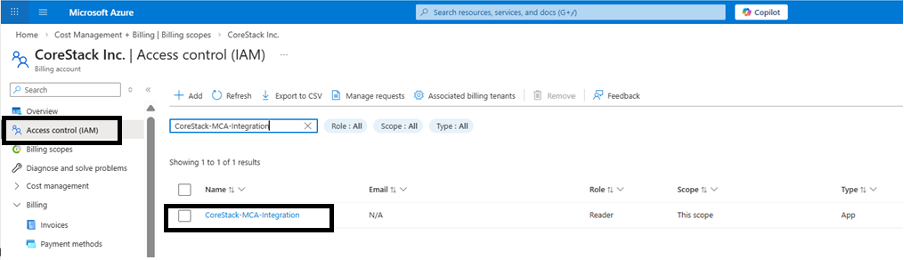 CoreStack requires the service principal to have Billing Account Reader access at the MCA billing account scope. This allows CoreStack to read billing profiles, invoice sections, and subscription data.