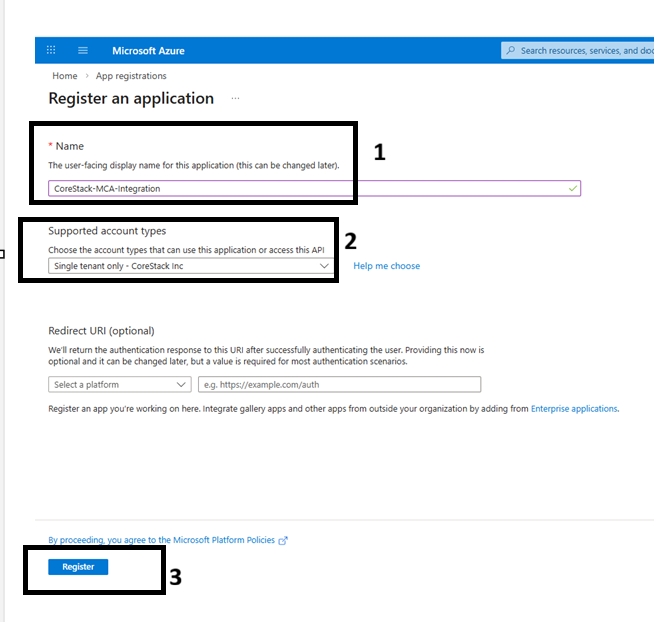 CoreStack-MCA-Integration). - Under Supported account types, select Accounts in this organizational directory only.