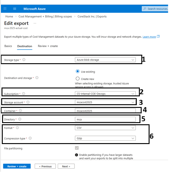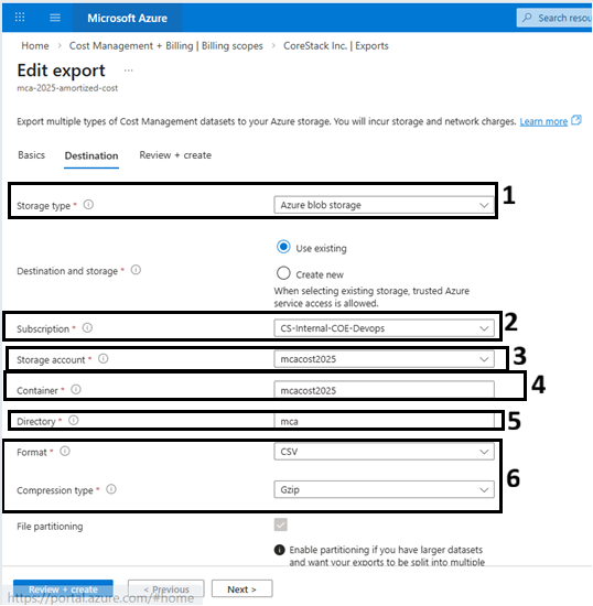 CoreStack requires billing cost data to be exported to an Azure Blob Storage container. You must configure exports for both Actual Cost and Amortized Cost.