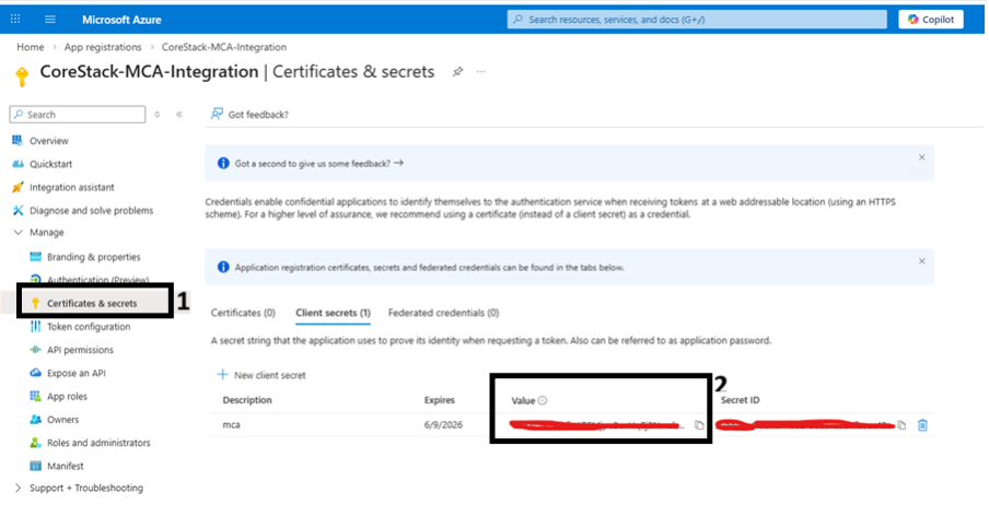 CoreStack MCA Secret) and select an expiration period.Important: Note the expiration date. You must rotate the secret in both Azure and CoreStack before it expires to avoid authentication failures.