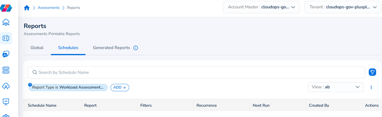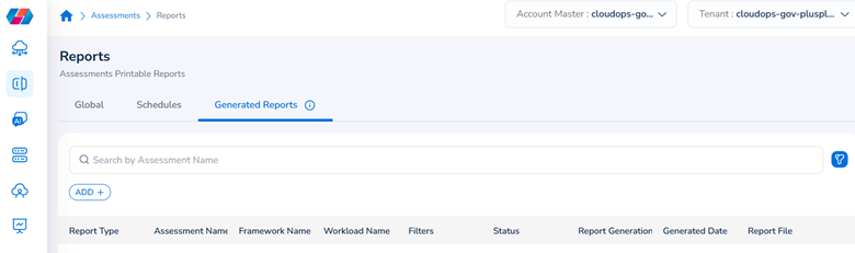 The Generated Reports tab shows the history of reports that have been generated in the past 30 days. The report history can be viewed in these columns – Report Type, Assessment Name, Framework Name, Workload Name, Filters, Status, Report Generation Type, Generated Date, and Report File.